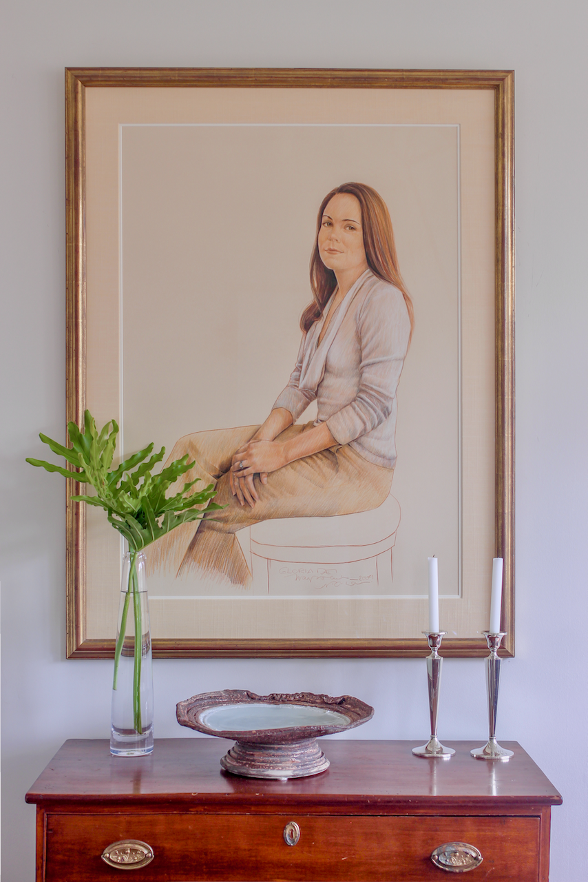 Collected artwork, as well as pieces by family and friends, can be seen throughout the home. That includes the portraits in the dining room by family friend Tim Trapolin and paintings in the half-bath by Carter’s grandmother, Elizabeth Jahncke. A piece by Claiborne’s aunt, Duane Couch, accompanies their children’s three-dimensional pieces in the office.