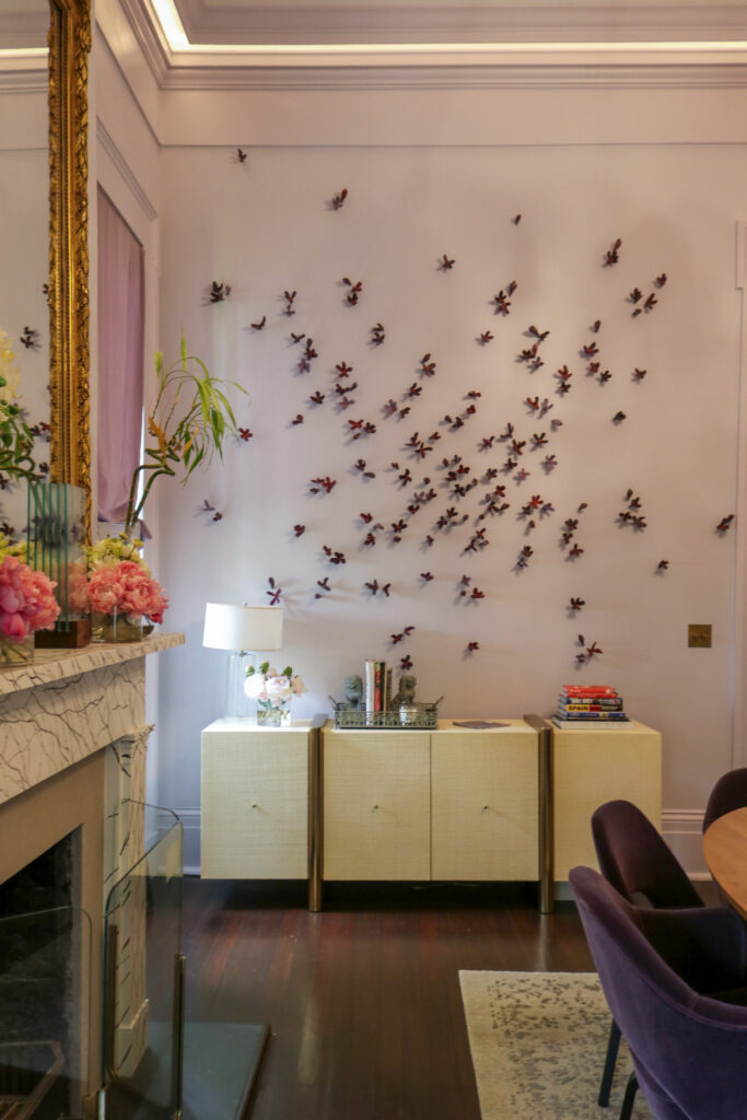 At the end of their entryway beneath the original floating curved staircase hangs a wiry, beaded dress sculpted by Key-Sook Geum. It’s just one of the home’s many opulent pieces.