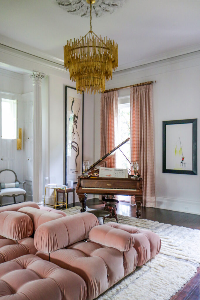 Their living room showcases a range of period pieces, from Biro’s mother’s piano — an 1850s Weber grand with ornately carved rosewood — to their retro Camaleonda sectional sofa.