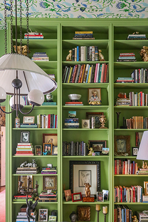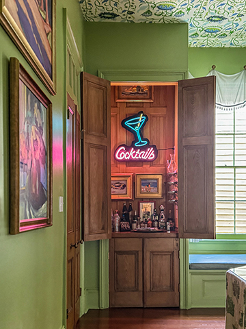 In their library, they’ve transformed cypress cupboards into twin bars, one illuminated by a neon cocktail sign by Nate Sheaffer. Across the room is a green floor-to-ceiling bookcase brimming with family photos, mementos and an ever-growing book collection.