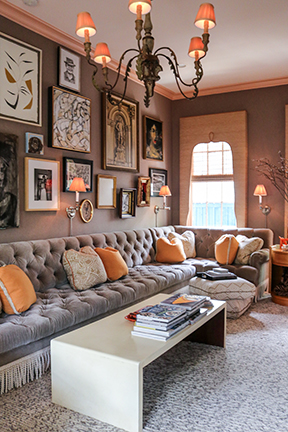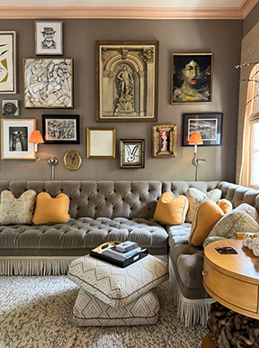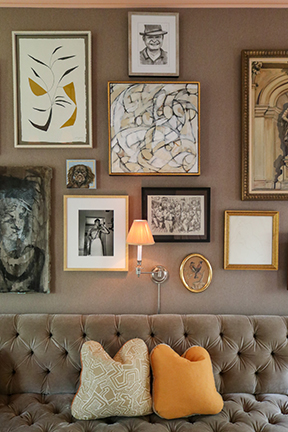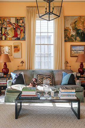 Most of the home’s neutral pieces are Erickson’s, while the pops of color are courtesy of Wood. At the center of it all is Huck, their chocolate King Charles Spaniel, who even has his own portrait.