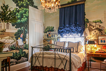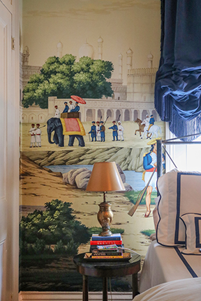 It’s hard to choose, but Wood admits his favorite room is the guest room. It’s enveloped in an Indian mural from the Paul Montgomery Studio, and anchored by a wrought iron bedframe designed by Mario Villa, one that Erickson had since before they moved in.
