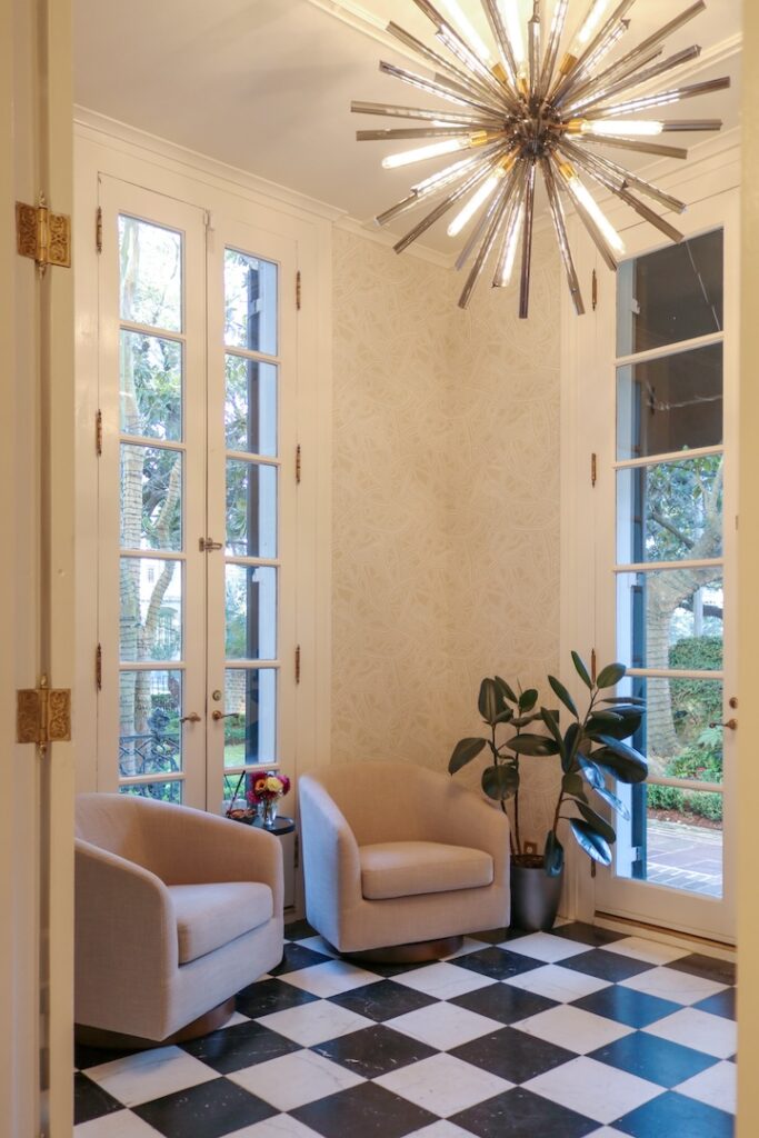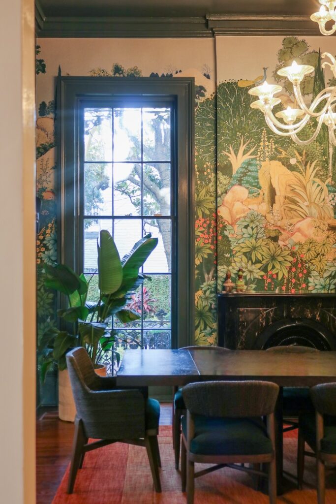 The current owners, who purchased the home in 2024, made only minor renovations to “make it comfortable for a family of five.” Among their favorite aspects are an existing Venetian chandelier and mural wallpaper in the dining room, the latter of which was suggested by designer Penny Francis of Eclectic Home. The outside is just as appealing.